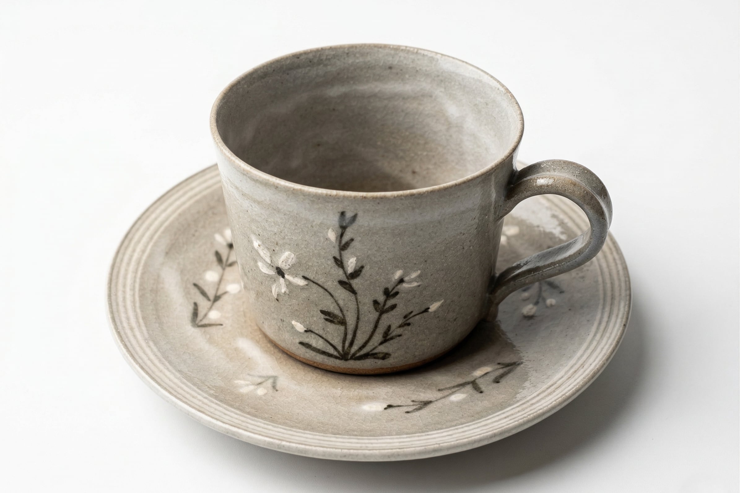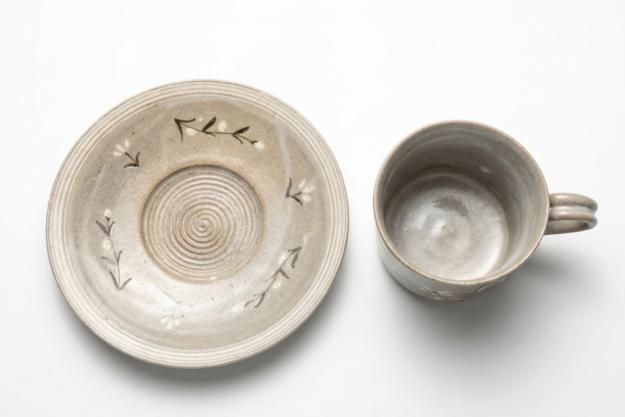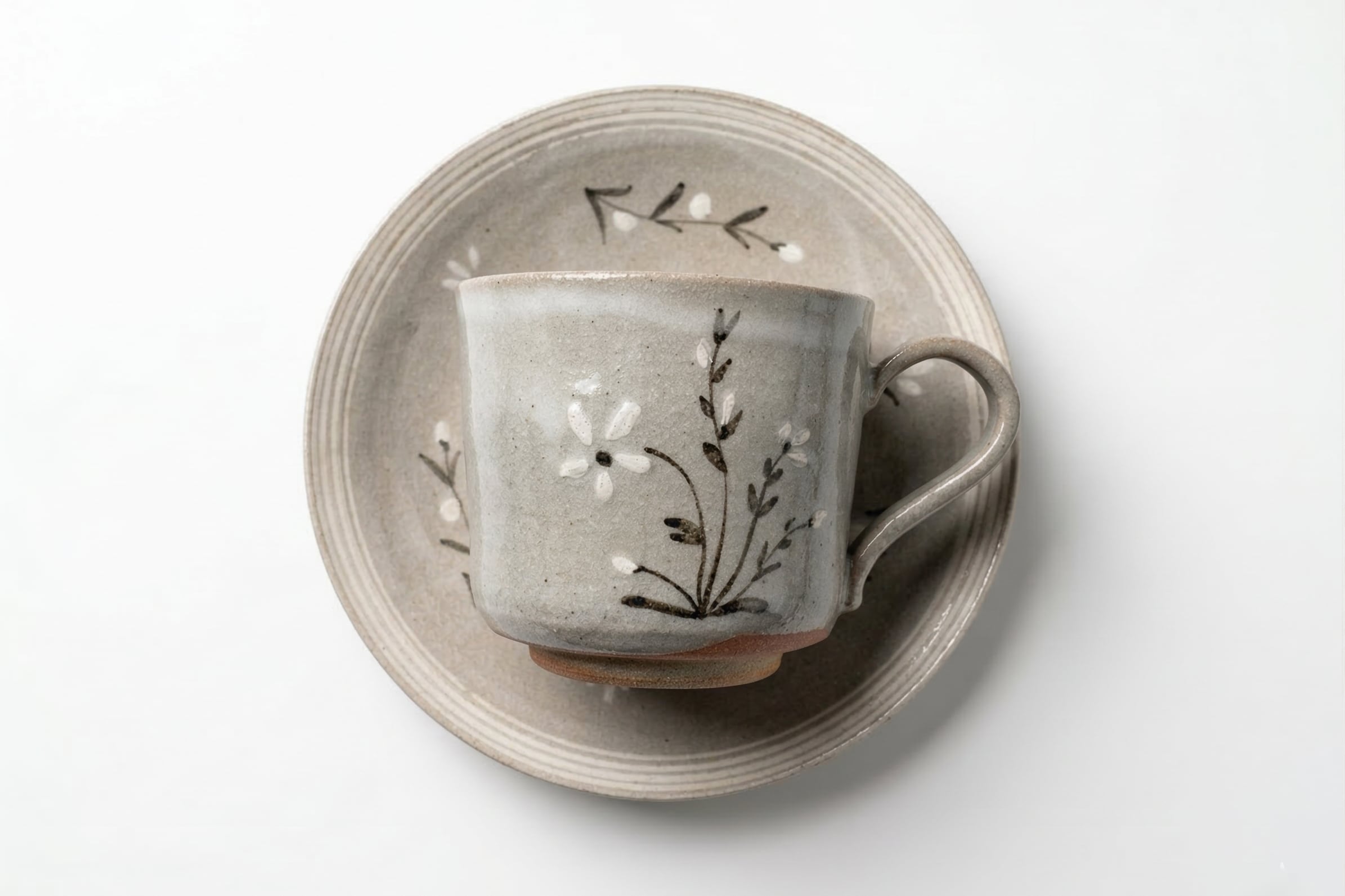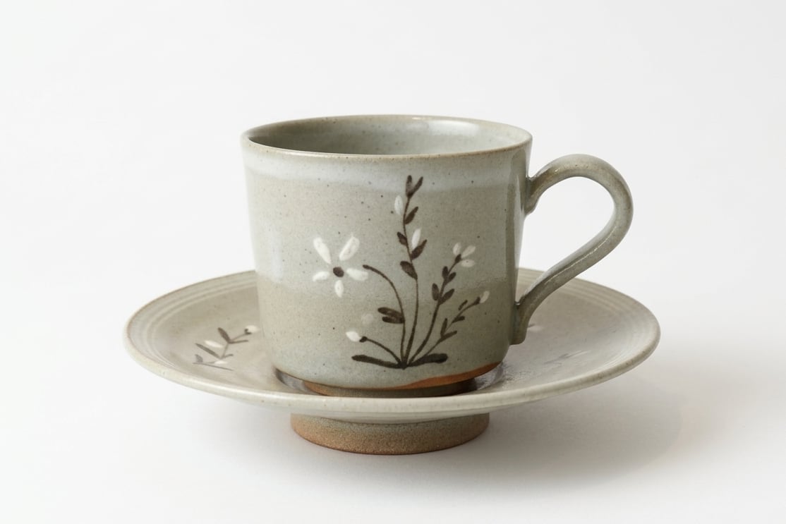 可憐な草花文が心和ませるデミタスカップ&ソーサー。絵唐津の伝統をモダンに昇華した意匠と、土の温もりが響き合います。静謐な筆致が日常に上質な余白を与え、特別な一杯を演出します。