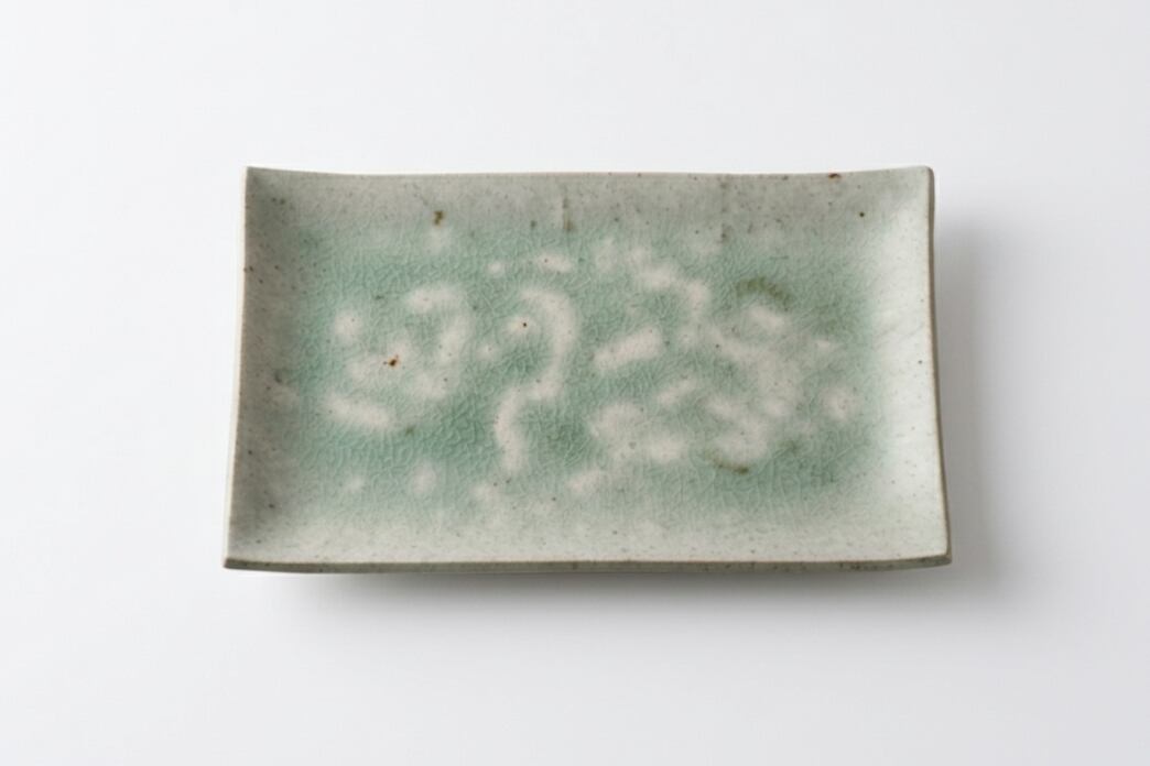 清涼感あふれる「灰釉長方皿」。貫入が織りなす繊細な表情と、吸い込まれるような淡い青緑色が美しく響き合います。端正な長方形の佇まいは、料理を洗練された一品へと引き立てます。