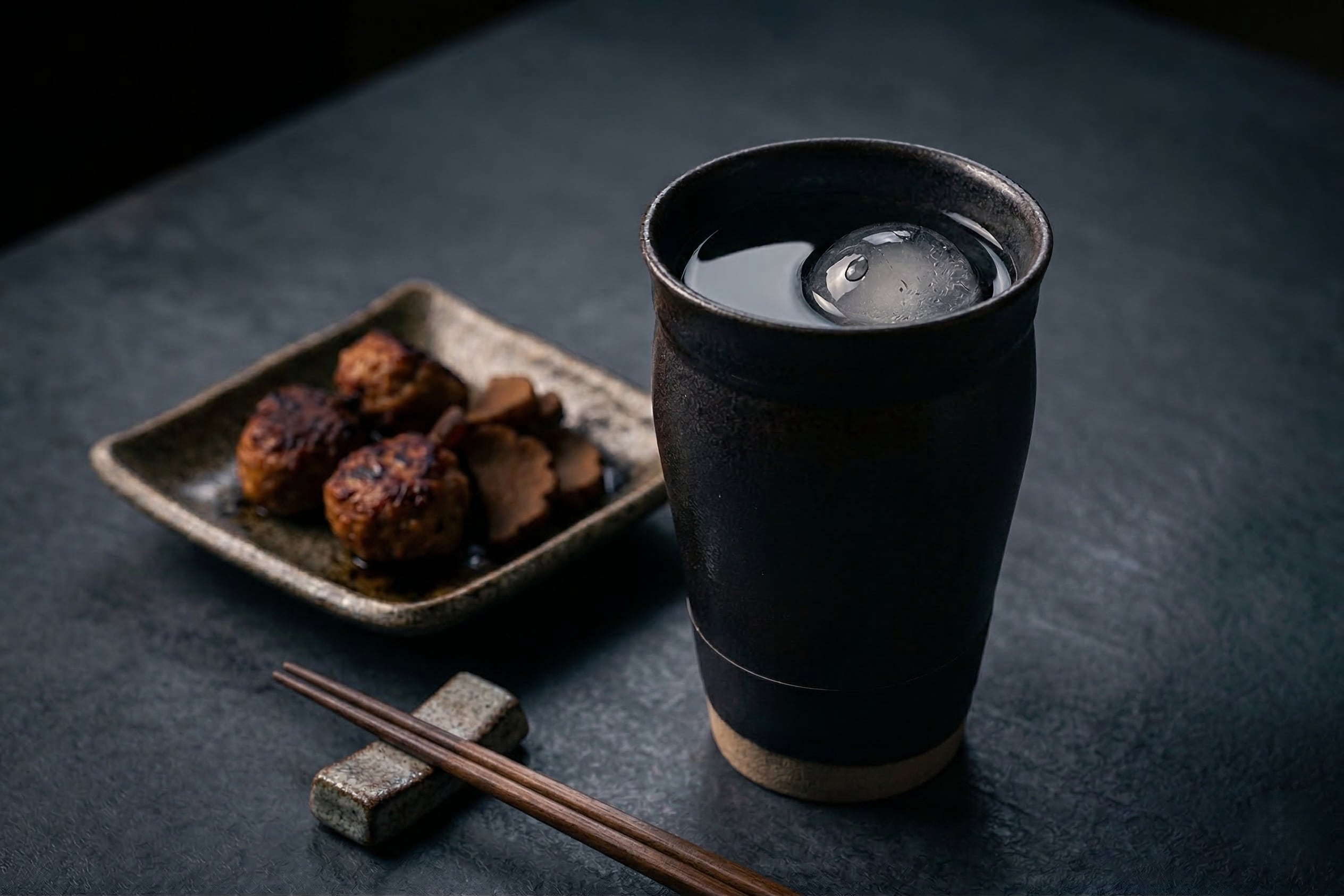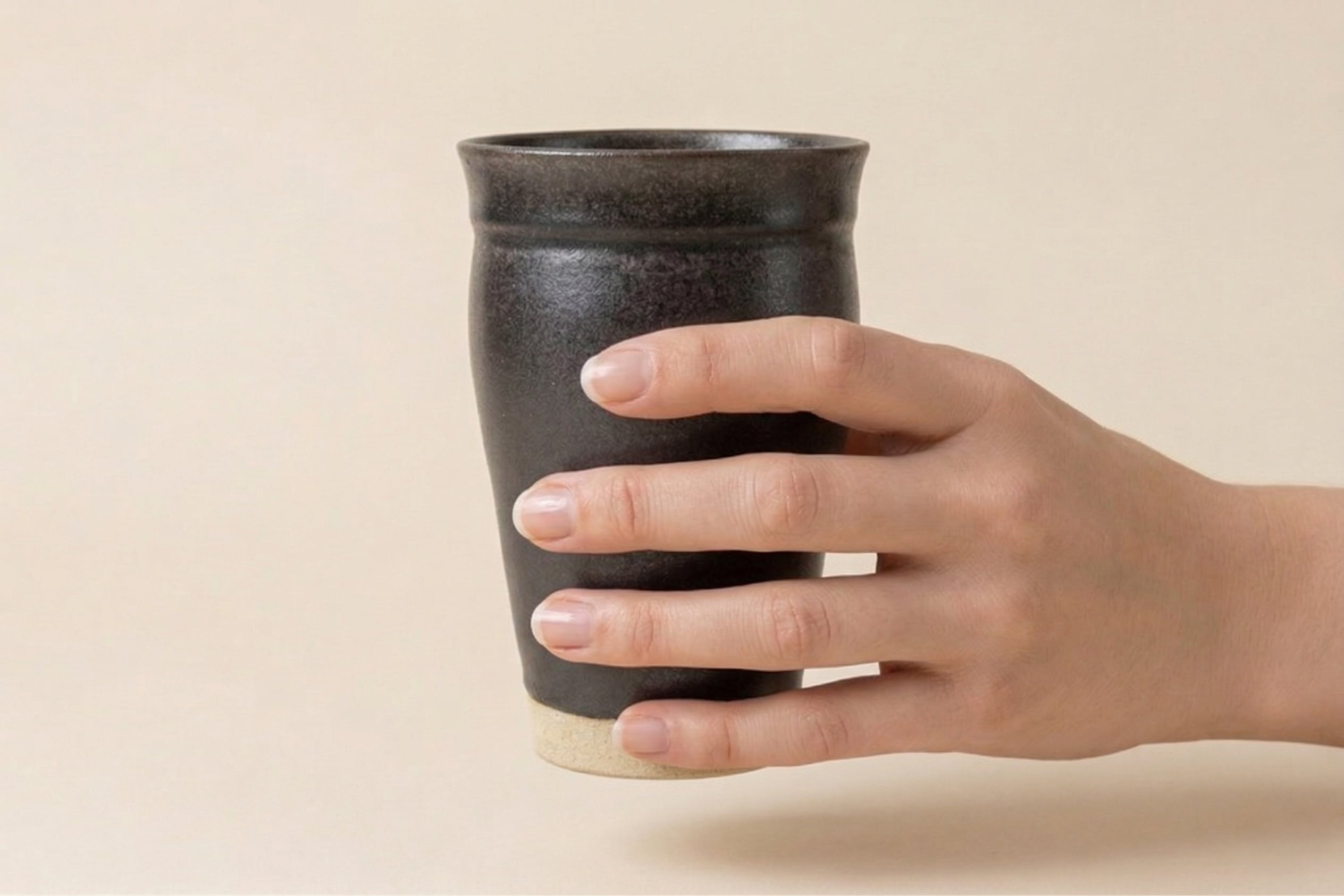 深い漆黒の釉薬が施されたこのフリーカップは、シンプルでありながら品格ある佇まいが魅力です。手に馴染む形状と、温かみのある土味が調和した、焼酎やお茶など幅広く使えるフリーカップです。