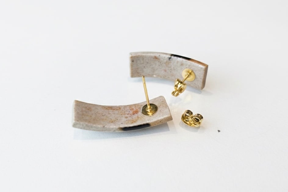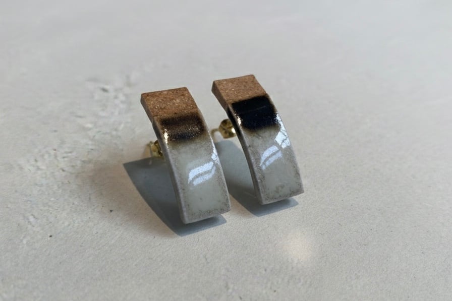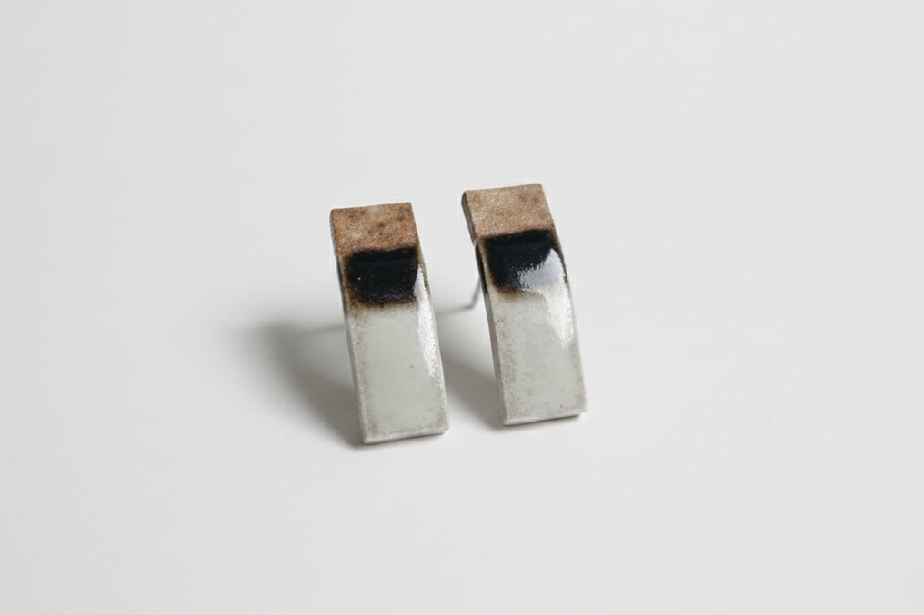 唐津焼の伝統的な朝鮮唐津の技法を用いた「朝鮮曲がりピアス」。黒と白の釉薬が混ざり合う、唯一無二の文様が耳元を彩ります。陶器ならではの温もりとモダンな造形が響き合い、日常の装いに唐津の洗練された美意識を添える逸品です。