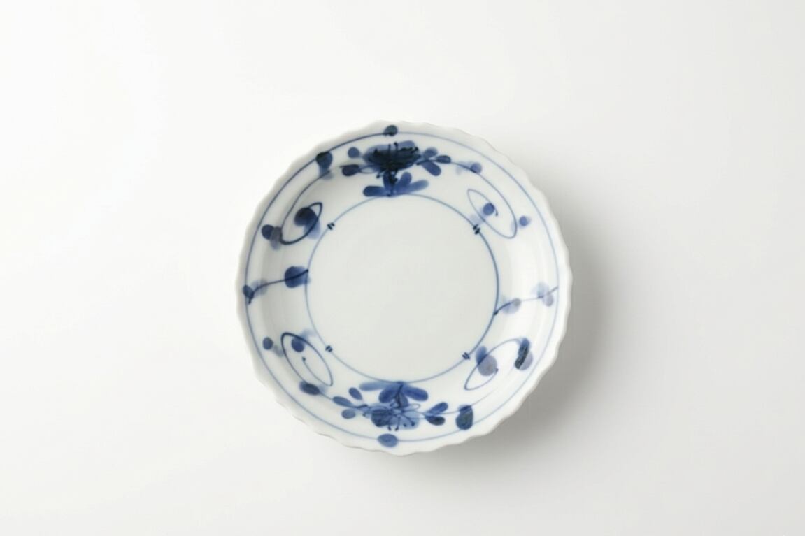 天平窯・岡晋吾氏が監修し、アリタポーセリンラボが手掛けた「輪花小皿牡丹唐草」。可憐な輪花の縁取りに、呉須の濃淡で描かれた牡丹唐草が上品に踊ります。磁器の艶やかな白が染付を引き立て、現代の食卓に華やかな品格と伝統の美を添える、日常使いにも贅沢な一客です。