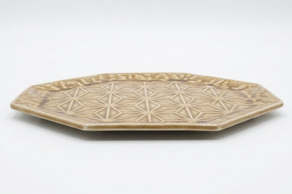 麻の葉文様が前面に施され、端正な形と落ち着いた釉調が食卓を上品に彩ります。盛り皿やワンプレートにも最適な存在感のある一枚です。