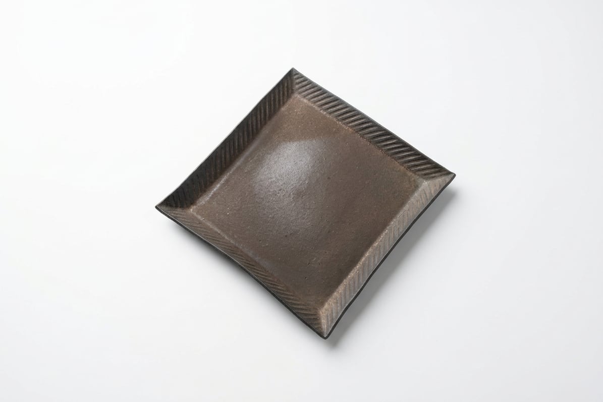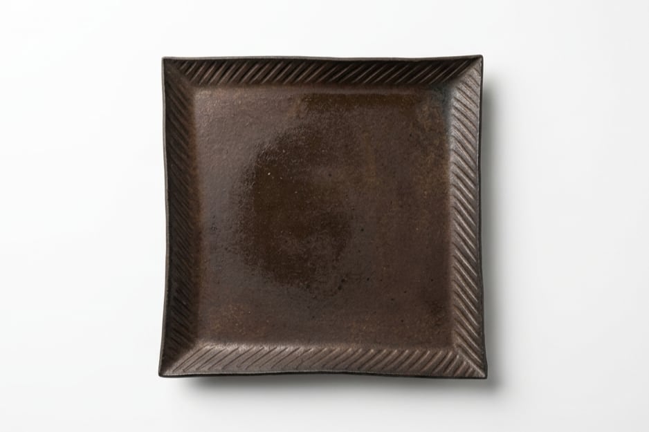 深みのある結晶釉が、金属のような重厚さと静かな華やぎを放ちます。縁に施された繊細な「鎬(しのぎ)」が陰影を生み、メイン料理を格調高く引き立てる、現代的な美意識が宿る一皿です。
