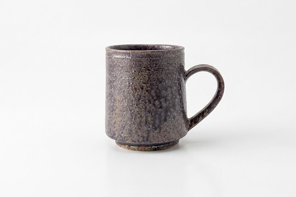 深みのある紫がかった釉薬とざらりとした質感が特徴で、落ち着いた雰囲気を楽しめます。持ちやすい取っ手で日常使いしやすく、コーヒーやお茶の時間に寄り添う一客です。
