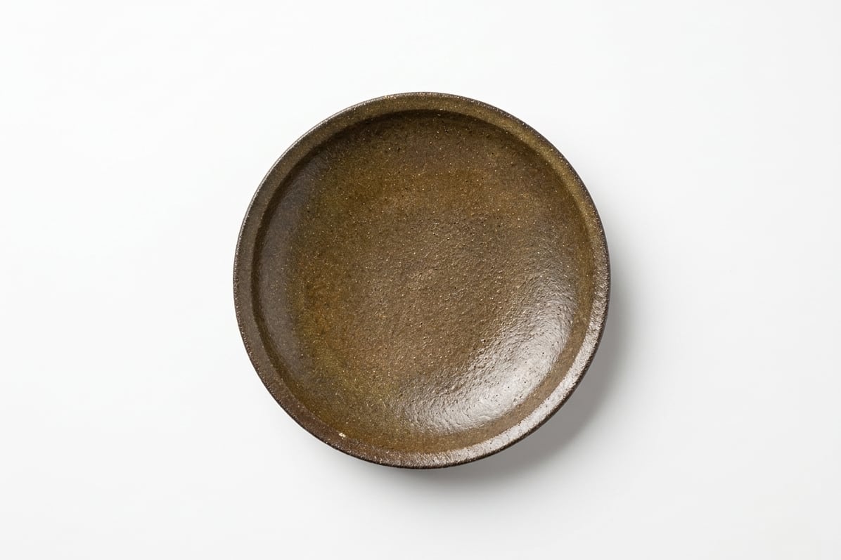三藤るい氏の手による、しっとりと艶やかな「黄唐津菓子皿」。藁灰釉が引き出す深みのある黄金色と、縁に現れる鉄釉の焦げ感が、古唐津のような野趣と気品を醸し出します。和菓子を美しく引き立て、茶のひとときを格調高く彩る一皿です。