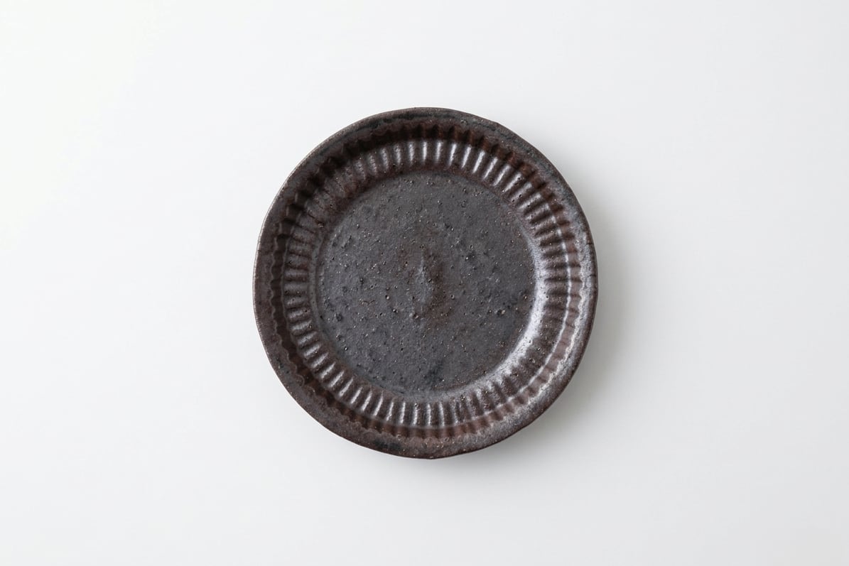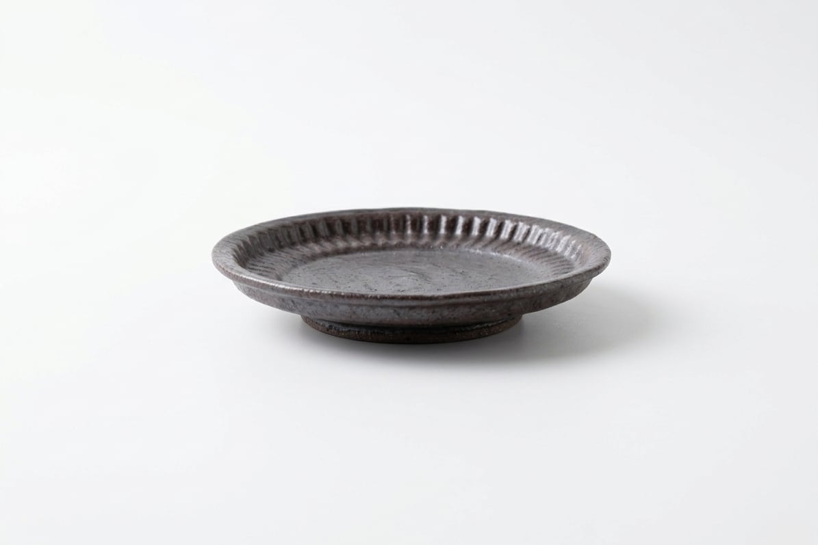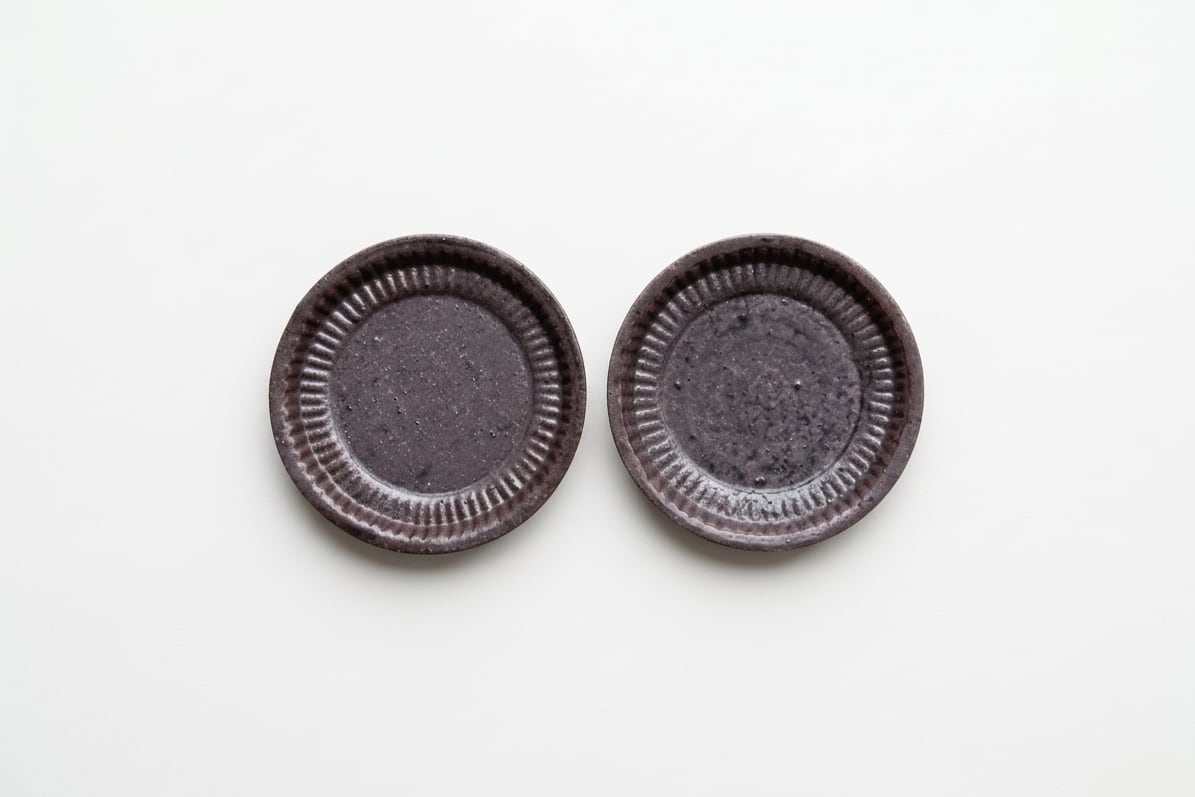 紫がかった鉄釉の深い色味に、細かな縞模様がぐるりと施された四寸皿。落ち着いた表情の中に程よい存在感があり、副菜を盛るのにちょうどいいサイズです。使うほどに味わいが増します。