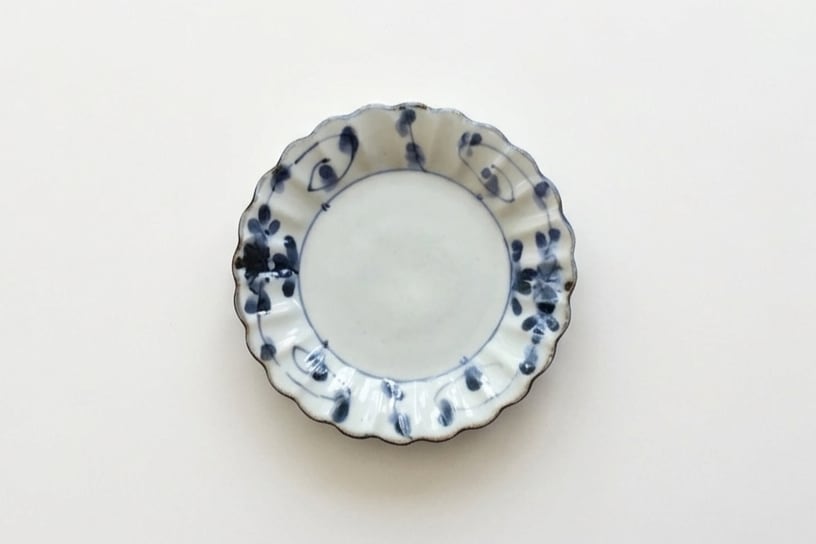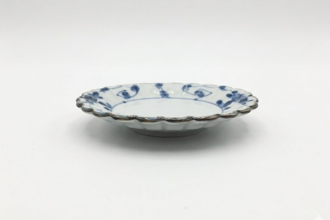 可憐な菊型の造形に、縁を彩る緻密な牡丹唐草が響き合います。白磁の清麗さと伝統美が融合した、食卓を品良く華やかに彩る一客です。