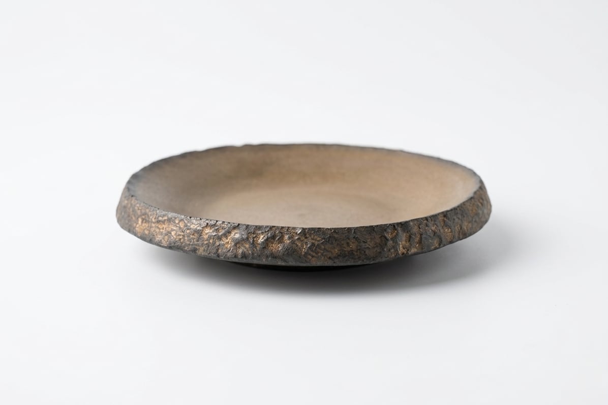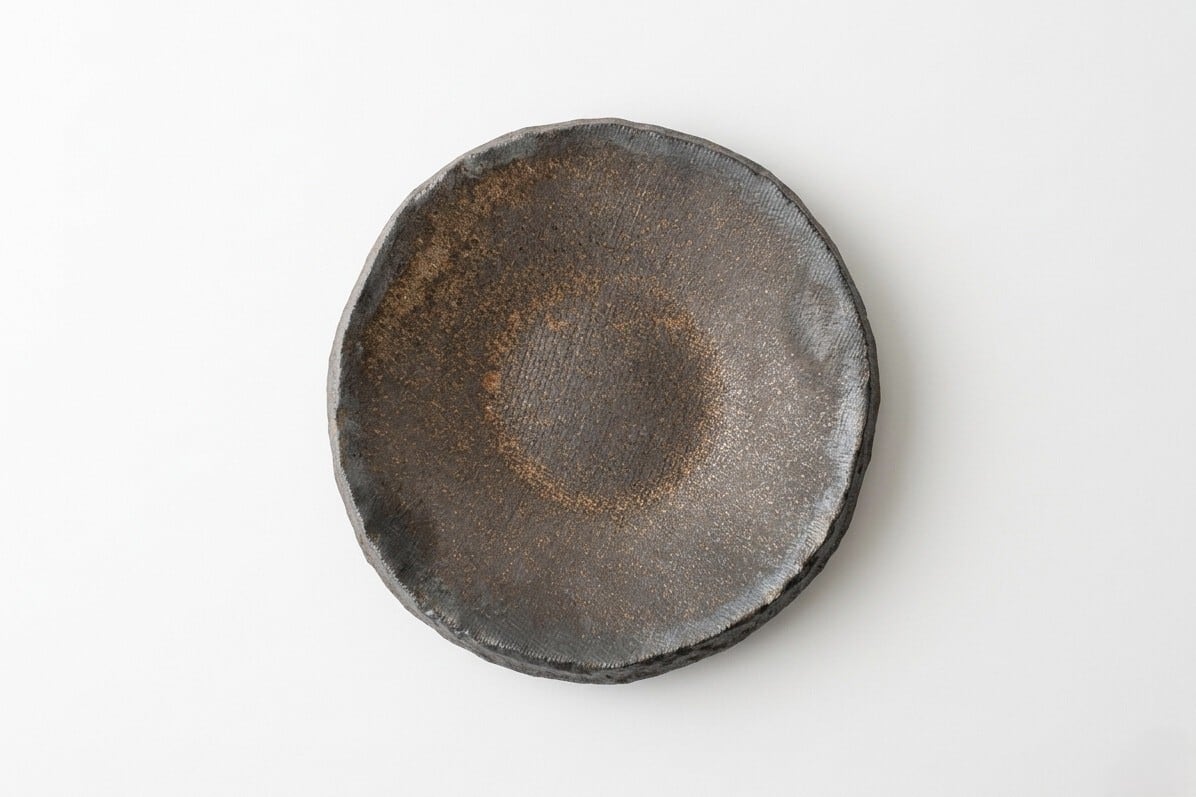 金属のような重厚感を放つマットゴールドの結晶釉が、食材の色彩を鮮やかに浮き上がらせます。縁に施された鎬(しのぎ)が陰影を生み、手に馴染む厚みとモダンな造形美が、日常の食卓を格調高く演出する一客です。