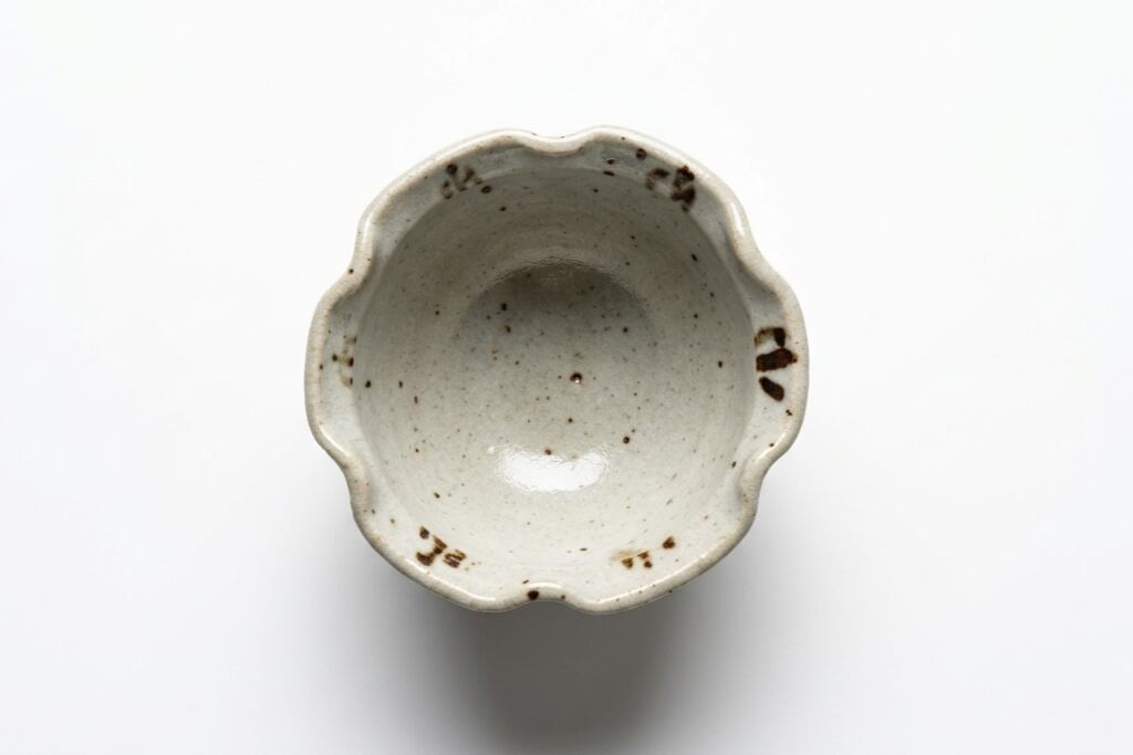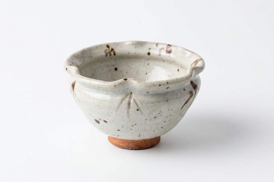 櫨ノ谷窯・吉野敬子氏による、古唐津の精神を現代に伝える「絵唐津向付」。温かみのある斑らな土肌に、伸びやかな筆致で描かれた草文様が風情を添えます。緩やかな輪花の縁取りが優美な陰影を生み、料理を包み込むような包容力と、確かな品格を併せ持つ一客です。
