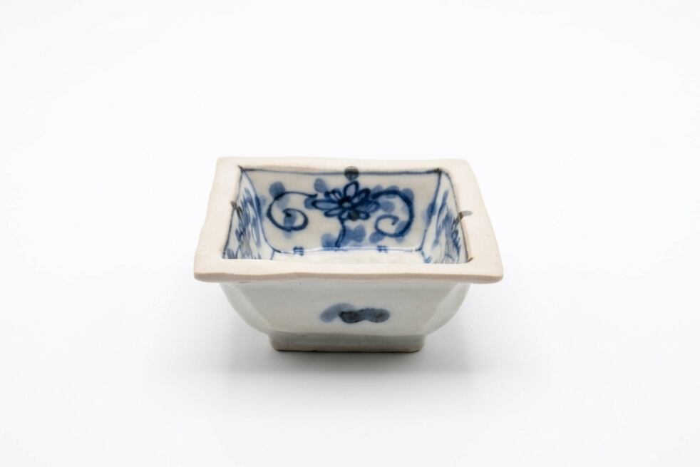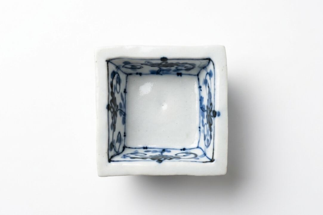 天平窯・岡晋吾氏が監修し、アリタポーセリンラボが手掛けた「角豆鉢 牡丹唐草」。手仕事の揺らぎを感じさせる四角い造形に、緻密な牡丹唐草が器の内側を品良く彩ります。白磁の清麗さと深い呉須の対比が美しく、食卓を格式高く引き立てる一客です。