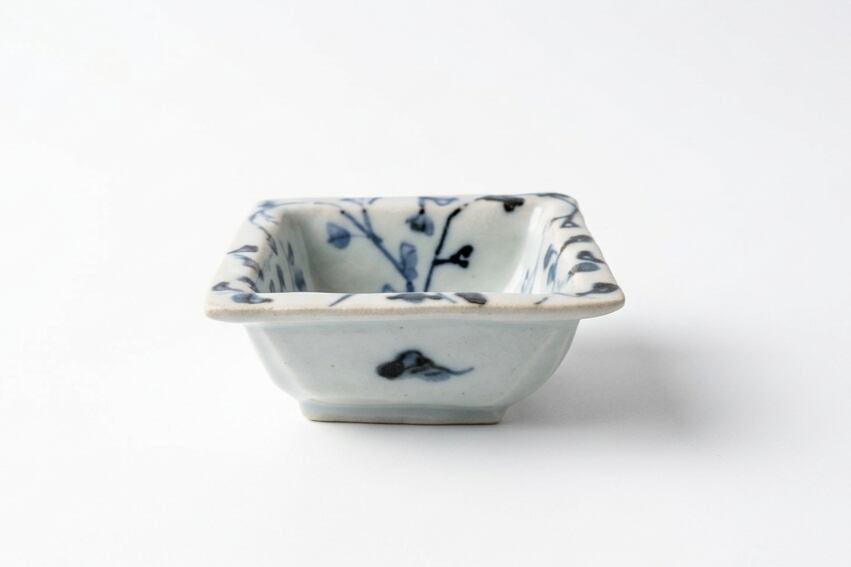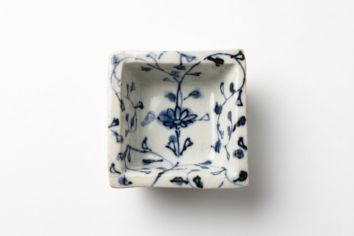天平窯・岡晋吾氏が監修し、アリタポーセリンラボが手掛けた「角豆鉢 染付万暦」。手仕事の揺らぎを感じさせる角形の造形に、伸びやかな筆致で描かれた草花文様が調和します。白磁の清麗さと深い呉須の対比が美しく、食卓を品良く彩る贅沢な小器です。
