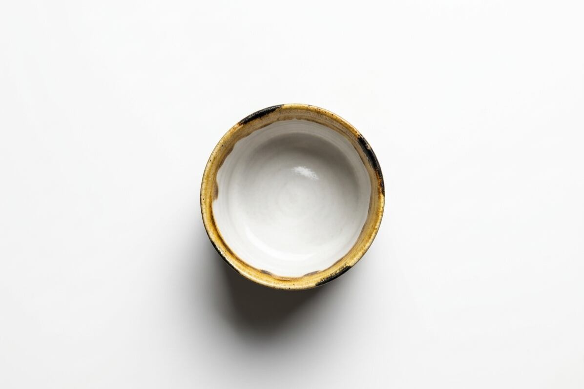 琥珀色をベースに黒や褐色の釉薬が溶け合うドラマチックな景色が魅力です。内側の白磁とのコントラストが酒の色を美しく引き立て、晩酌の時間を格別なものにしてくれます。