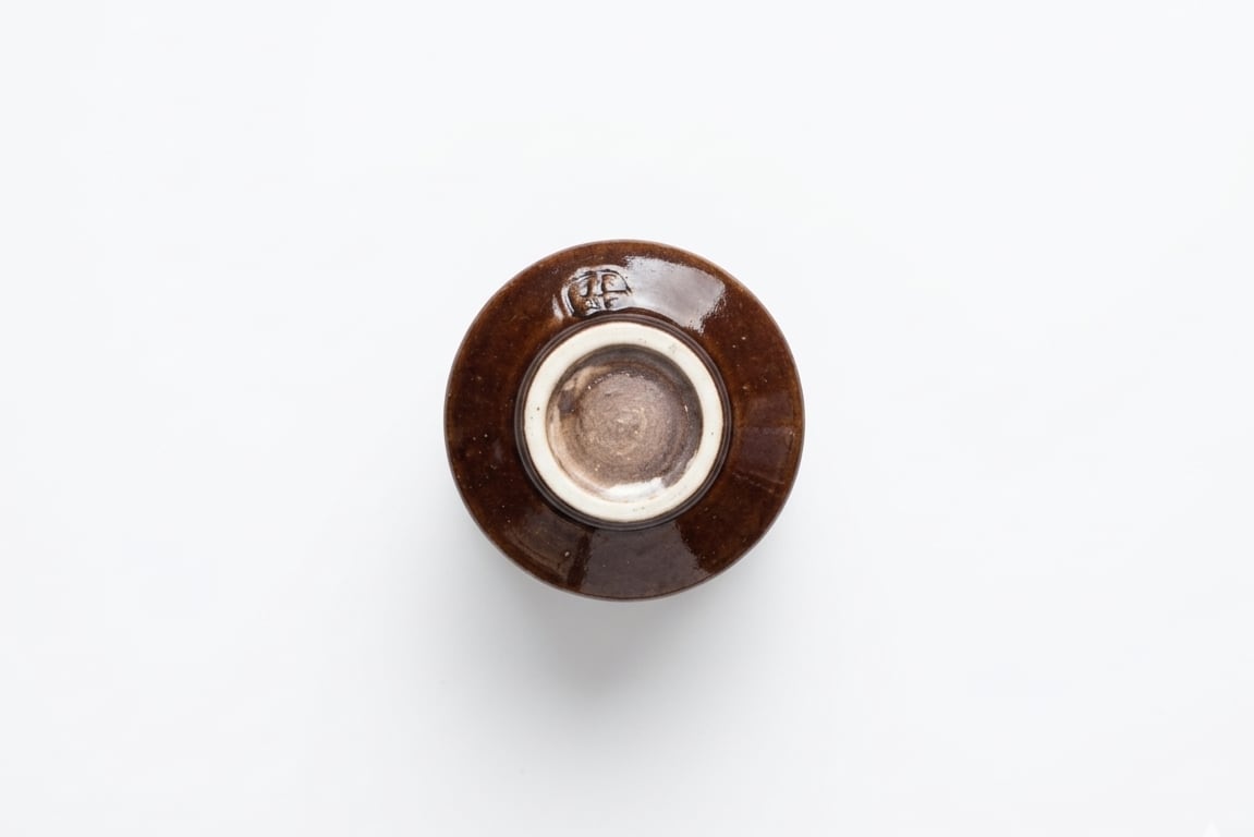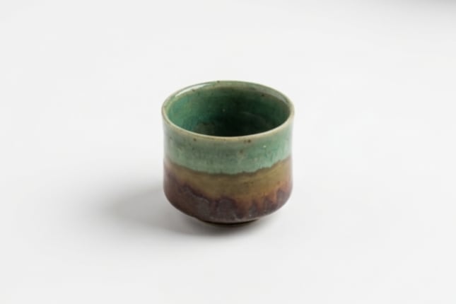 深い緑から褐色へと移ろう釉薬のグラデーションが、静寂に包まれた松林の情景を彷彿とさせます。内側の柔らかな白磁との対比が、注いだお酒を瑞々しく引き立てます。