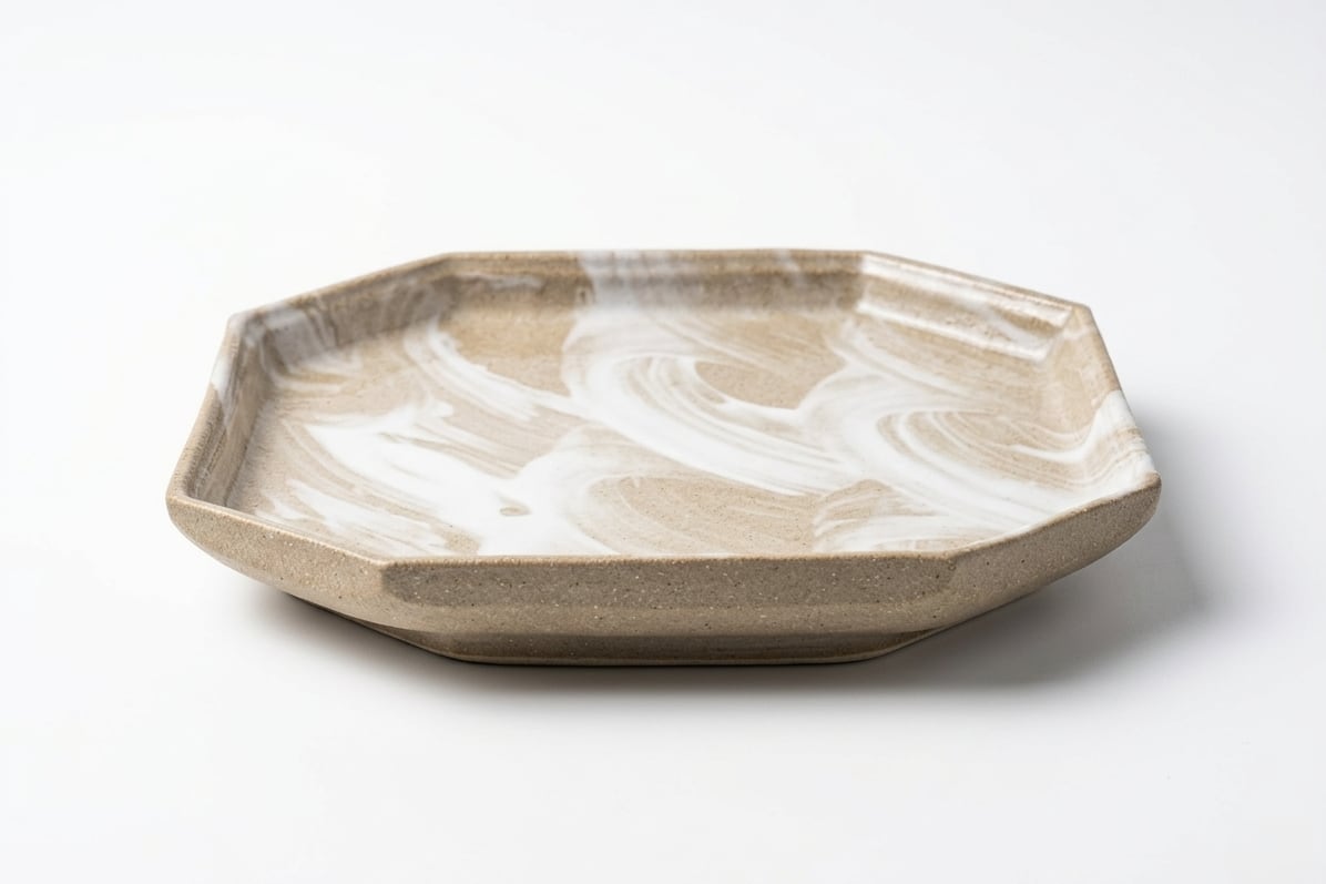 勢いよく引かれた刷毛目の白が、素朴な土肌の上で躍動感あふれる景色を描き出します。凛とした八角形の造形と手仕事の力強さが共生し、メイン料理からデザートまで、盛り付けるものを芸術的に引き立てる一枚です。
