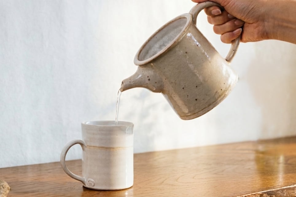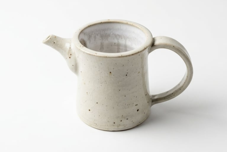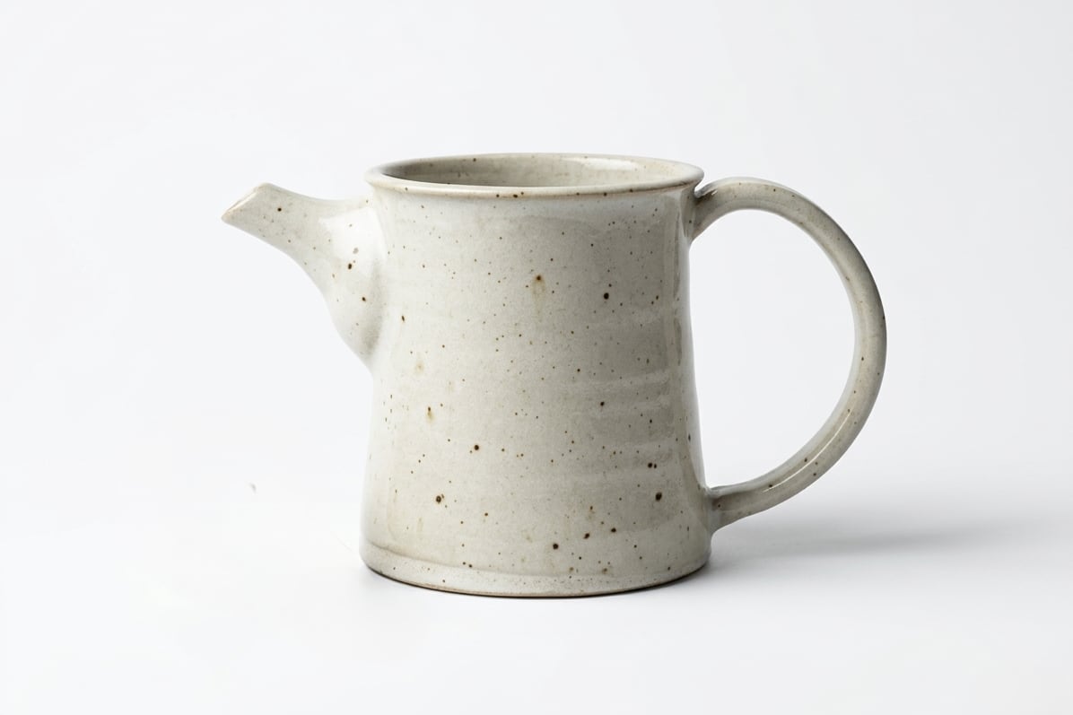 しっとりとマットな白釉に、手仕事ならではの鉄点が静かな景色を描きます。無駄を削ぎ落とした筒形の造形と、キレの良い注ぎ口。機能美を追求したミニマルなデザインが、現代のティータイムに洗練された豊かさを運ぶ一客です。