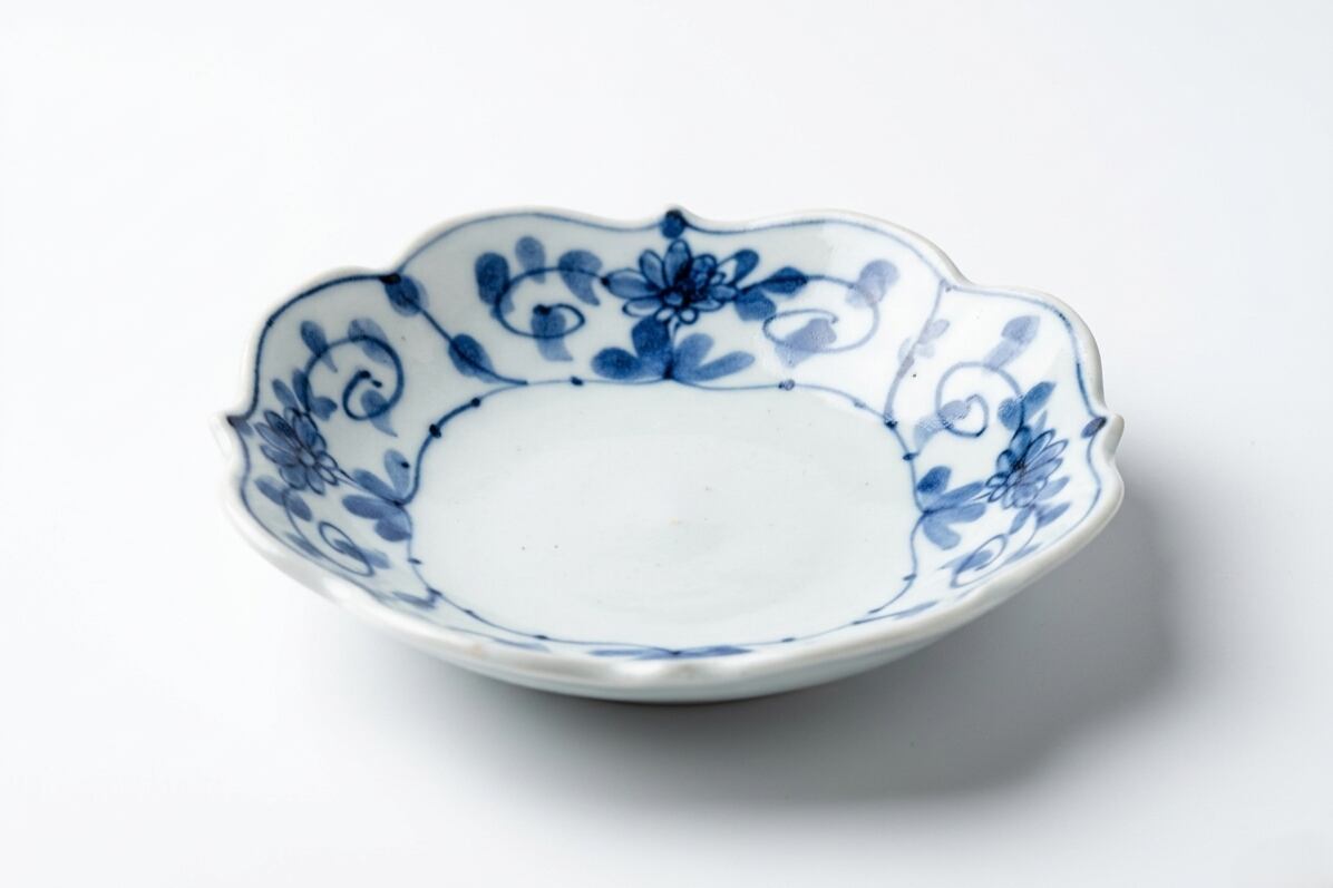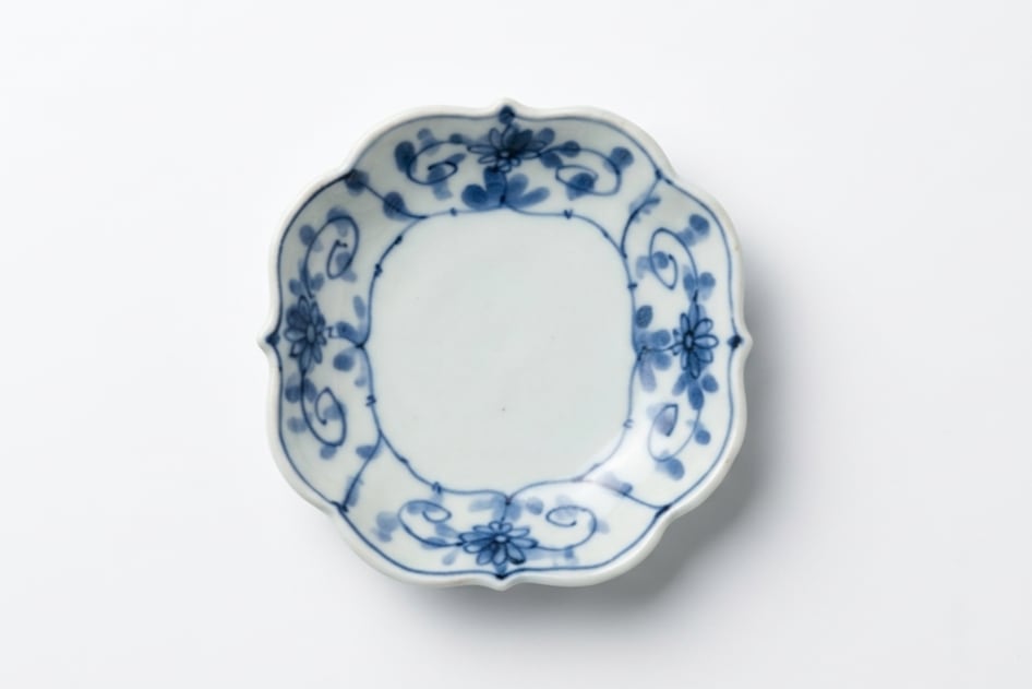 四隅を美しく立ち上げた稜線が、伝統的な牡丹唐草の文様を品良く引き立てます。白磁の清麗さと深い呉須の対比がモダンな印象を与え、食卓を華やかに格上げしてくれる一客です。